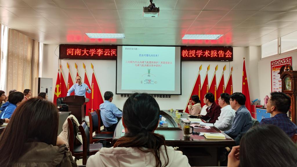2023年3月9日上午,应tyc5997太阳集团邀请,河南大学周树堂教授和李云河教授在生物楼412会议室,分别做了题为“昆虫高生殖力的遗传基础与分子调控机制解析”和“二化螟与褐飞虱协作应对水稻抗虫防御的生态和分子机制”的学术报告,公司青年教师及部分员工聆听了报告。报告会由经理饶本强教授主持。