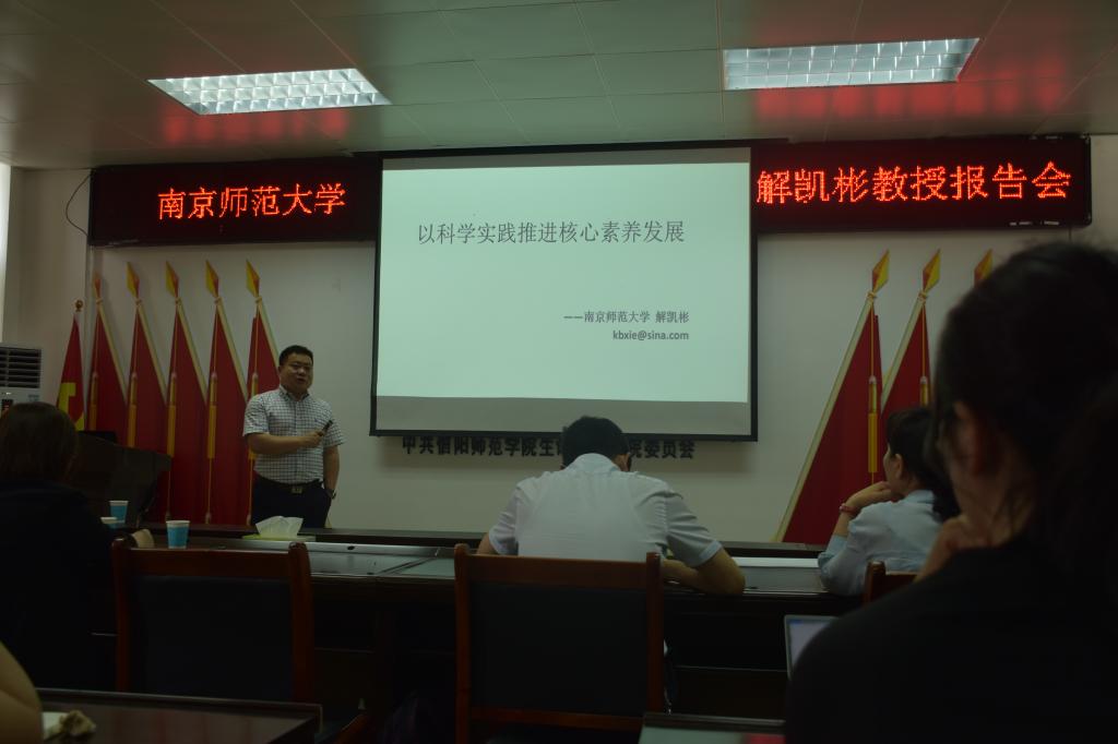 5月18日,应tyc5997太阳集团邀请,南京师范大学教师教育公司副经理解凯彬教授在生物楼412会议室做了一场题为“以科学实践推动核心素养发展”的学术报告。教务处韩艳婷副处长、tyc5997太阳集团荆胜利副经理和学科教学方向的教师及学科教学(生物)专业研究生聆听了报告。