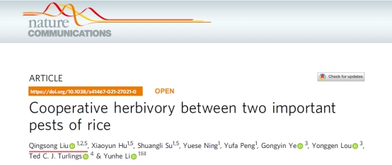 11月19日,国际知名学术期刊《Nature Communications》(五年影响因子:15.81)在线发表了公司tyc5997太阳集团刘清松博士等人完成的题为“Cooperative herbivory between two important pests of rice”的研究论文。这是公司科研人员首次以第一作者身份在Nature系列子刊发表研究论文。