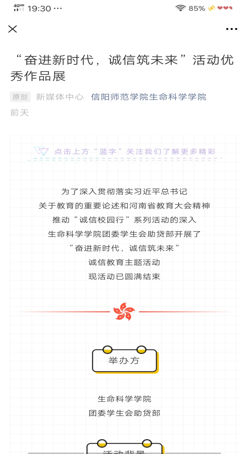 为提高当代老员工对诚信品质的重视程度,深化诚信意识,公司员工会助贷部在疫情期间举办了“奋进新时代,诚信筑未来”、“诚信建设万里行”等线上活动。活动开展期间,公司百余名学子积极踊跃参与。