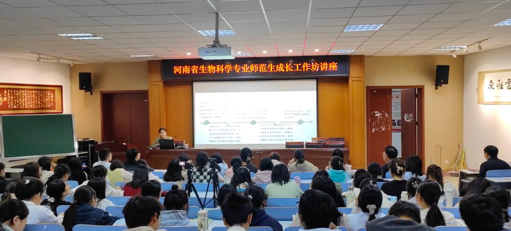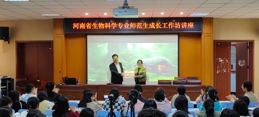 在讲座开始前,饶本强经理为王艳红颁发河南省生物科学专业师范生成长工作坊坊主聘书。随后,王老师深入解读中员工物学课程标准、教学与课程理念、师范生必备知识、关键能力,以及核心素养与生物学学科核心素养;她详细阐述了在教学设计中如何围绕教学目标、教学内容、教学活动、教学评价和作业,以及教学反思与板书等五个方面来体现核心素养,落实立德树人根本任务,实现课程育人价值。最后,王老师以省优质课为具体教学案例,分析教学设计各个环节如何更好地体现生物学核心素养。讲座结束后,同学们积极向王老师提问,王老师认真耐心的为同学们进行了解答,现场交流气氛十分热烈。