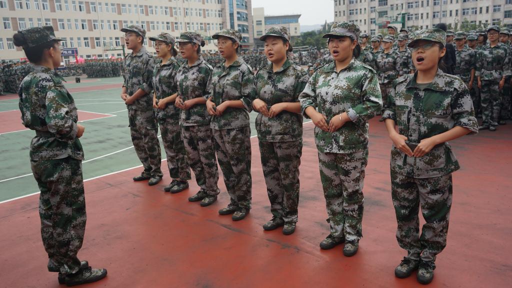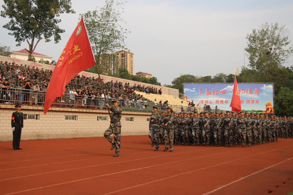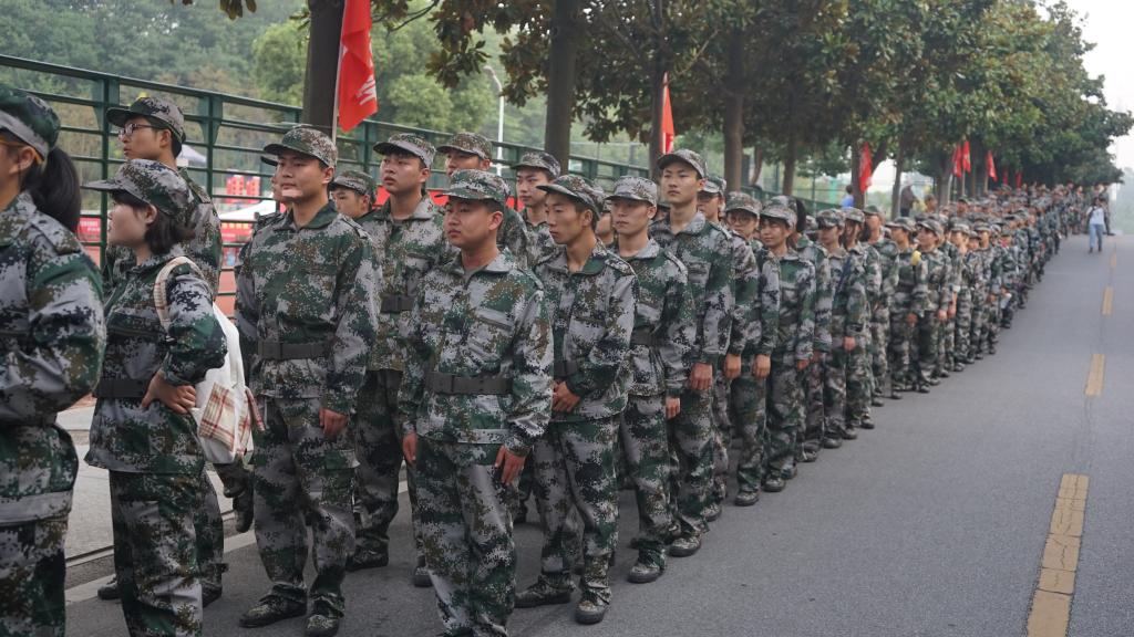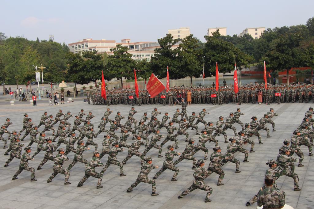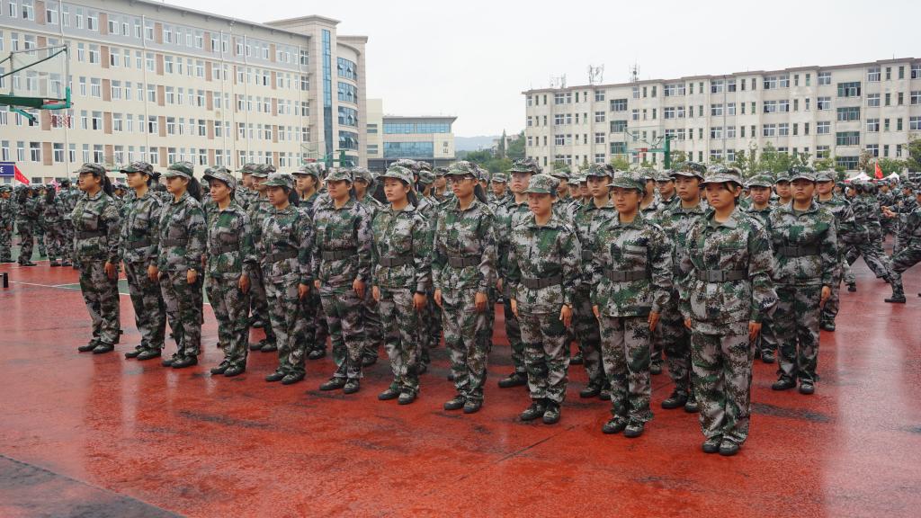 军训第一天,公司新生身着统一服装,排着整齐的队伍参加开学典礼暨军训动员大会。