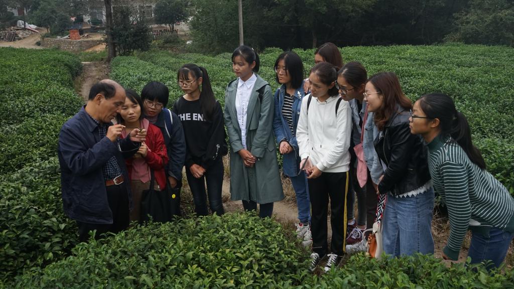 10月13日,2019级茶学本科班9名老员工,在班长姜慧敏、团支书张品芝和学习委员张雯雯的组织下,邀请公司茶树生物学省级重点实验室主任江昌俊教授担任茶园实践教学教师,去往信阳市浉河区浉河港镇、董家河镇的四望山茶场、黄龙寺茶场、瞭望台茶场、广义茶场开展课外实践教学,辅导员杨霁虹、朱晓雯参加。