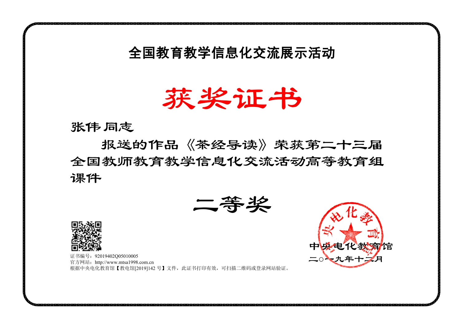 近日,中央电化教育馆下发《关于公布第二十三届全国教师公司产品信息化交流活动优秀作品名单的通知》(教电馆〔2019〕142号),公司教师张伟报送的作品《茶经导读》荣获第二十三届全国教师公司产品信息化交流活动二等奖。
