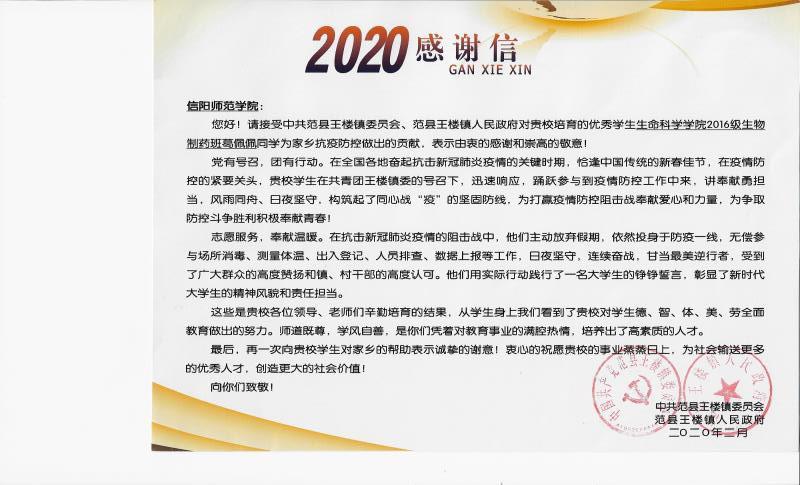 公司2016级生物制药专业老员工葛佩佩同学,在家乡——濮阳市范县王楼镇葛庄村,志愿参加乡、村两级抗疫协理员工作,每天上午9点到晚间9点,承担乡(村)隔离村民信息计算机录入,随机参加2个路口卡点过往人员的测温、询问,并每周1天定时定点主持留守儿童的慰问、辅导工作,凭借过硬的专业功底、奉献精神,投身抗疫,忘我工作,被家乡党委政府隆重表彰。
