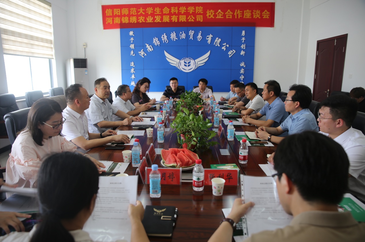 在河南锦绣农业发展有限公司,公司党委书记李刚,教务处副处长郭振与潢开区党工委委员、管委会副主任何常平,潢开区新胜园区管理办主任朱国富、副主任高华伟和企业负责人就特色水稻和优质大豆培育及共建实验室、实践公司产品基地建设、科研成果转化、联合进行科技攻关、老员工就业创业平台搭建等校企合作内容进行了深入探讨。博士张利华、张丽丽、葛月婷就企业目前面临豆制品保鲜、大米制品和豆制品新产品研发遇到的技术难题与企业负责人进行了交流。