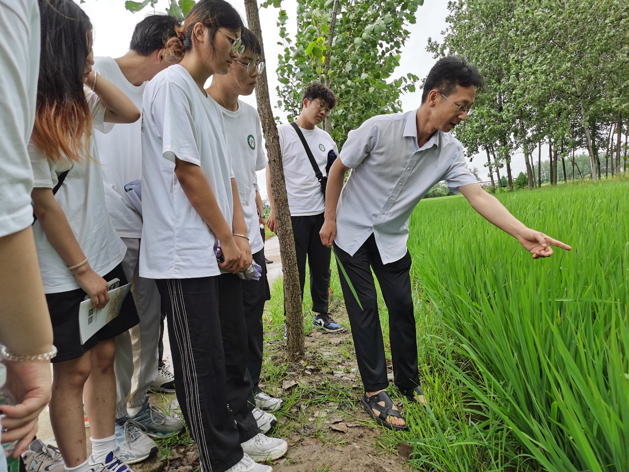 在万营村水稻栽培基地,河南省优秀科技特派员彭波博士结合水稻大田生长现状,给同学们讲解了水稻遗传育种、栽培种植、病虫害防治、田间水肥管理等方面的知识,特别强调利用现代生物科技进行功能基因的发掘与优质高产绿色水稻新品种培育的重要意义与应用价值。并针对水稻生产提质增效、新品种培育等问题与基地负责人进行了深入交流。