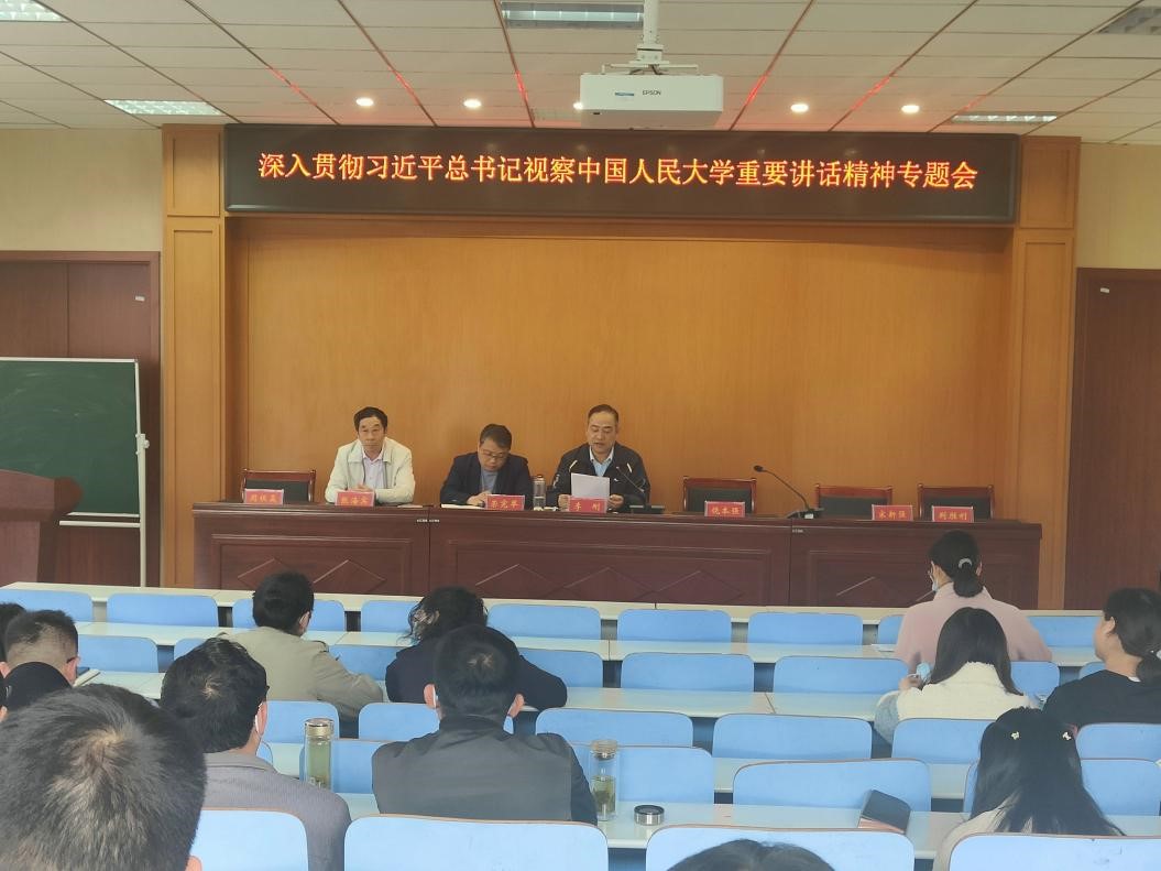 为进一步加强理论武装,切实提高党员干部和广大教职工的政治觉悟和理论水平,增强“四个意识”,坚定“四个自信”,做到“两个维护”, 按照《信阳师范公司党委理论学习中心组学习实施细则》《中共信阳师范公司委员会2022年党委理论学习中心组分专题集体学习安排意见》《信阳师范公司2022年教职工政治理论学习安排意见》等文件要求,5月10日,tyc5997太阳集团召开党委理论学习中心组(扩大)专题会以及全体教职工学习会,学习研讨习近平总书记视察中国人民大学重要讲话精神。